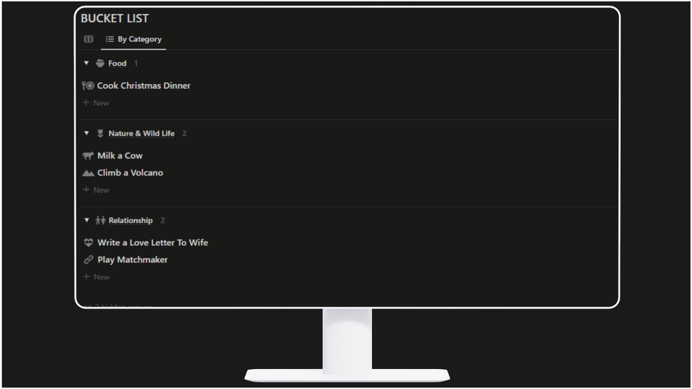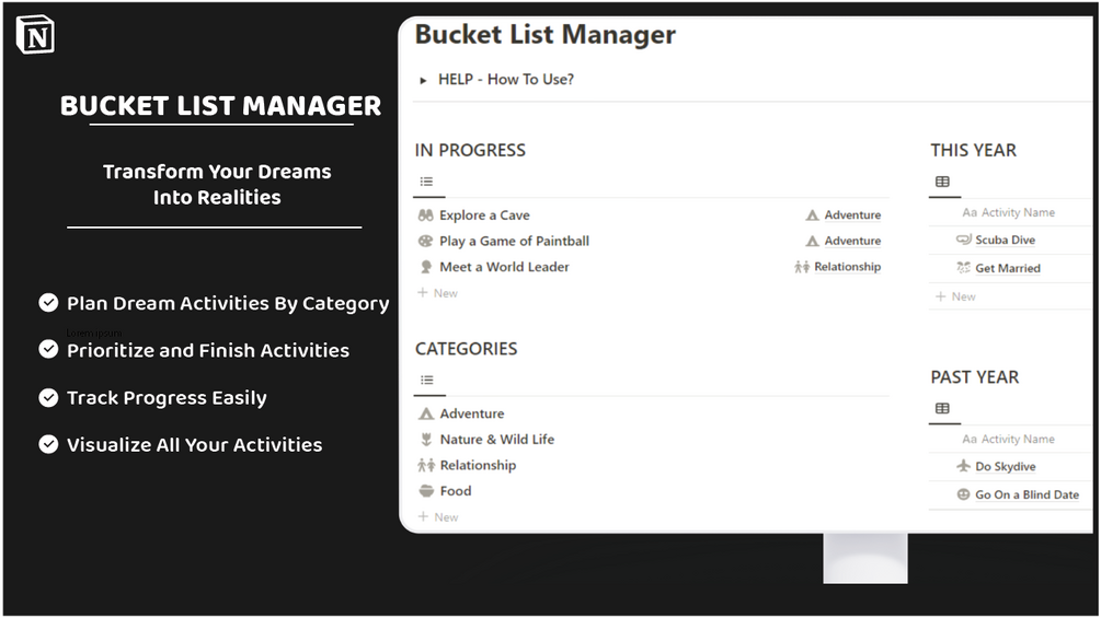 - Customize your list with activities that inspire you, and add new categories to tailor it to your unique aspirations.
