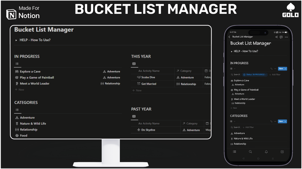 - Whether it's skydiving, traveling to exotic destinations, or trying new cuisines, this Bucket List Manager is your guide to living life to the fullest!