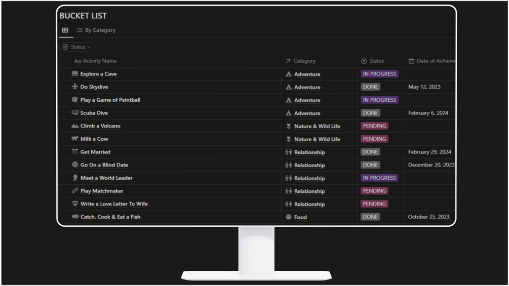 - Create and maintain a list of all your dream activities, categorized by adventure, nature & wildlife, relationships, food, and more.