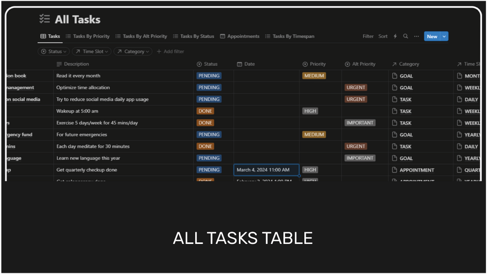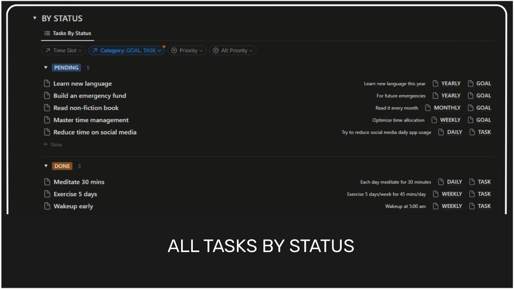 - Smart Filtering Options: Easily sort and filter tasks by time span, status, priority, and category for streamlined organization.