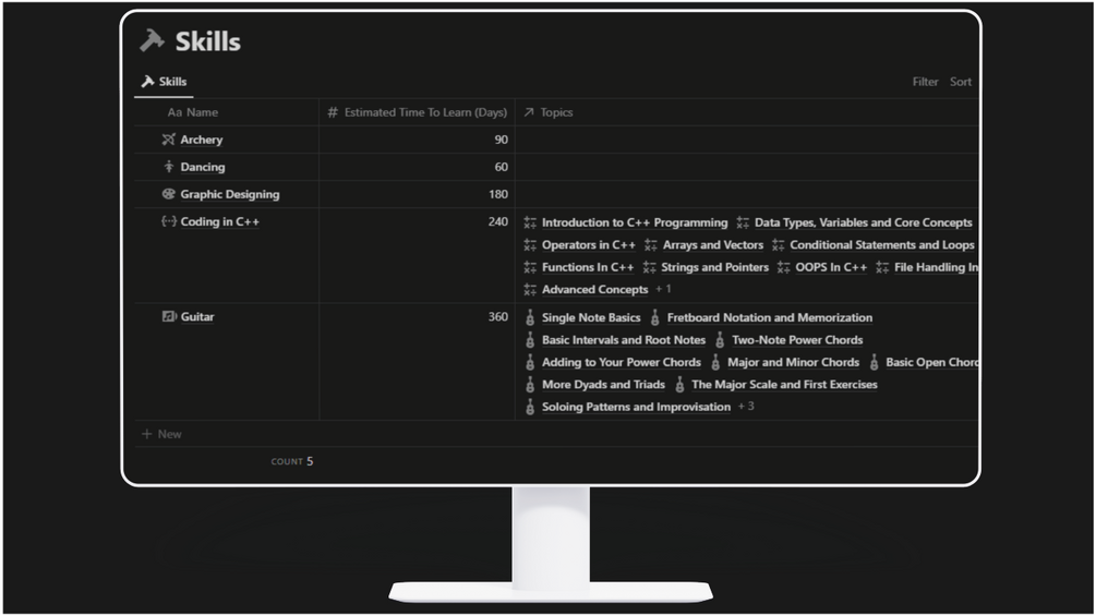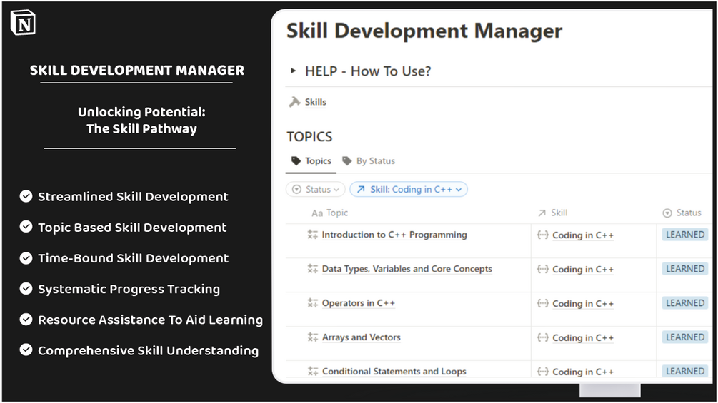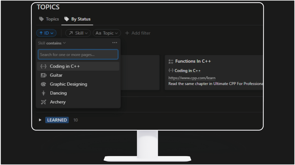 - Status-Based Topic Organization: Track topic progress by status (learning, yet to learn, learned) within each skill, allowing for systematic skill development.