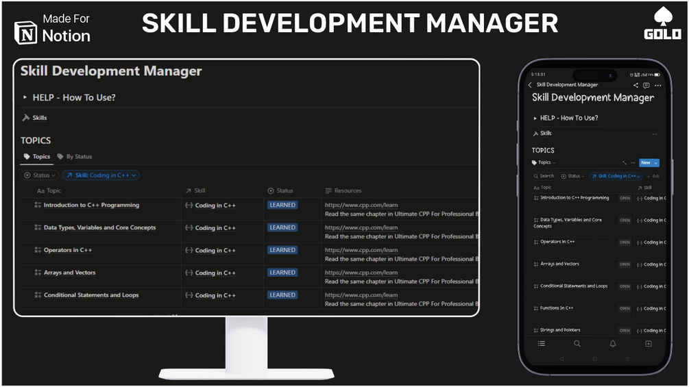 - Progress Updates: Update topic status and related information as you progress in learning, ensuring your skill development stays on track.