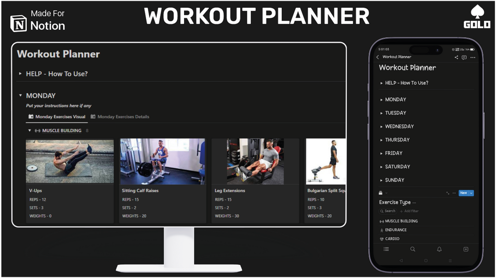 - Weekly Planning: Plan workouts for each day of the week from Monday to Sunday, including exercise details and instructions specific to each day.